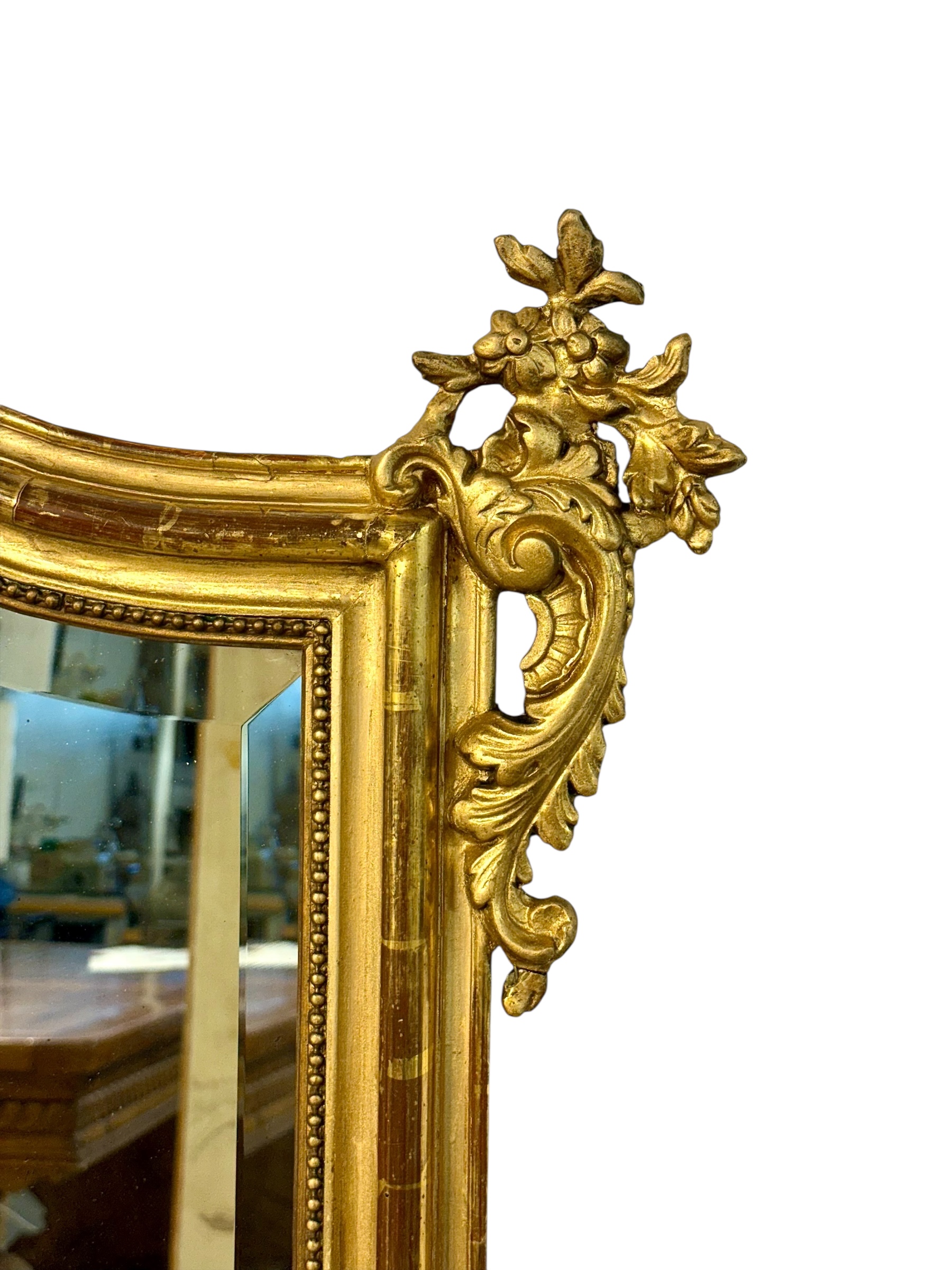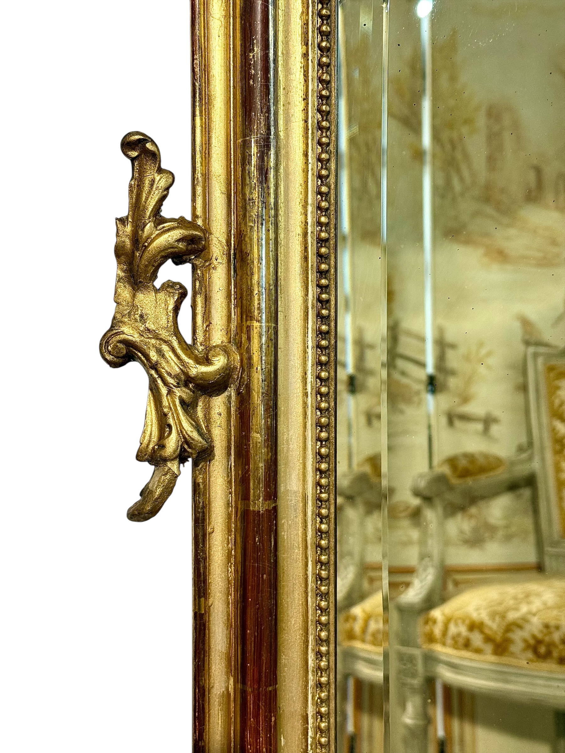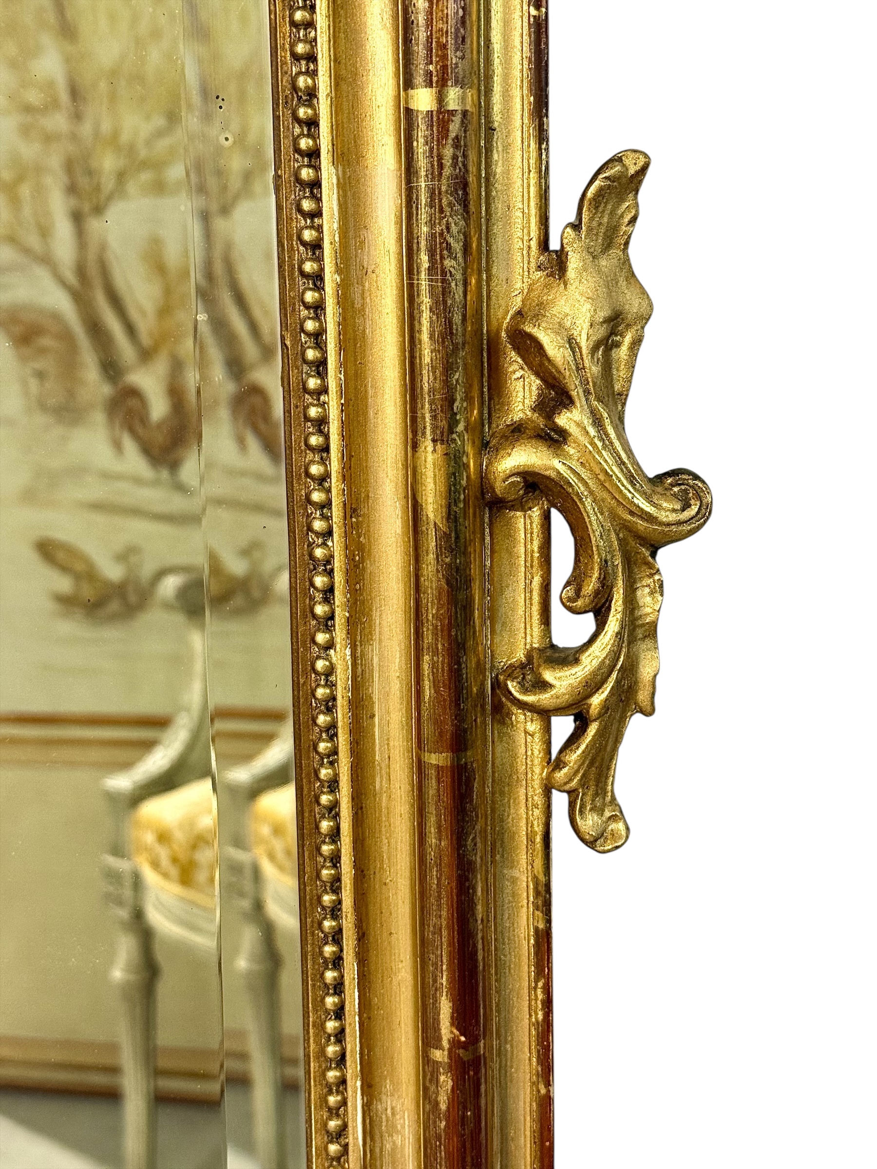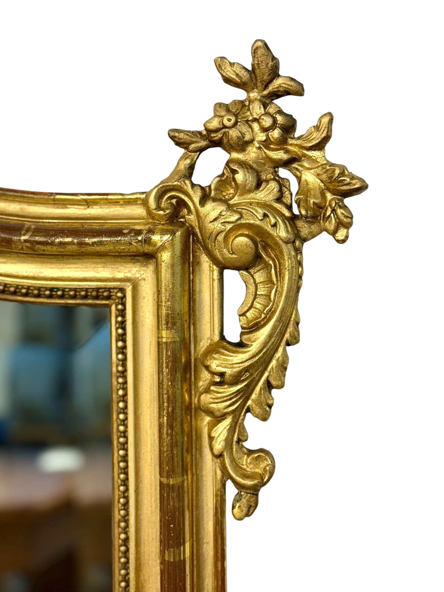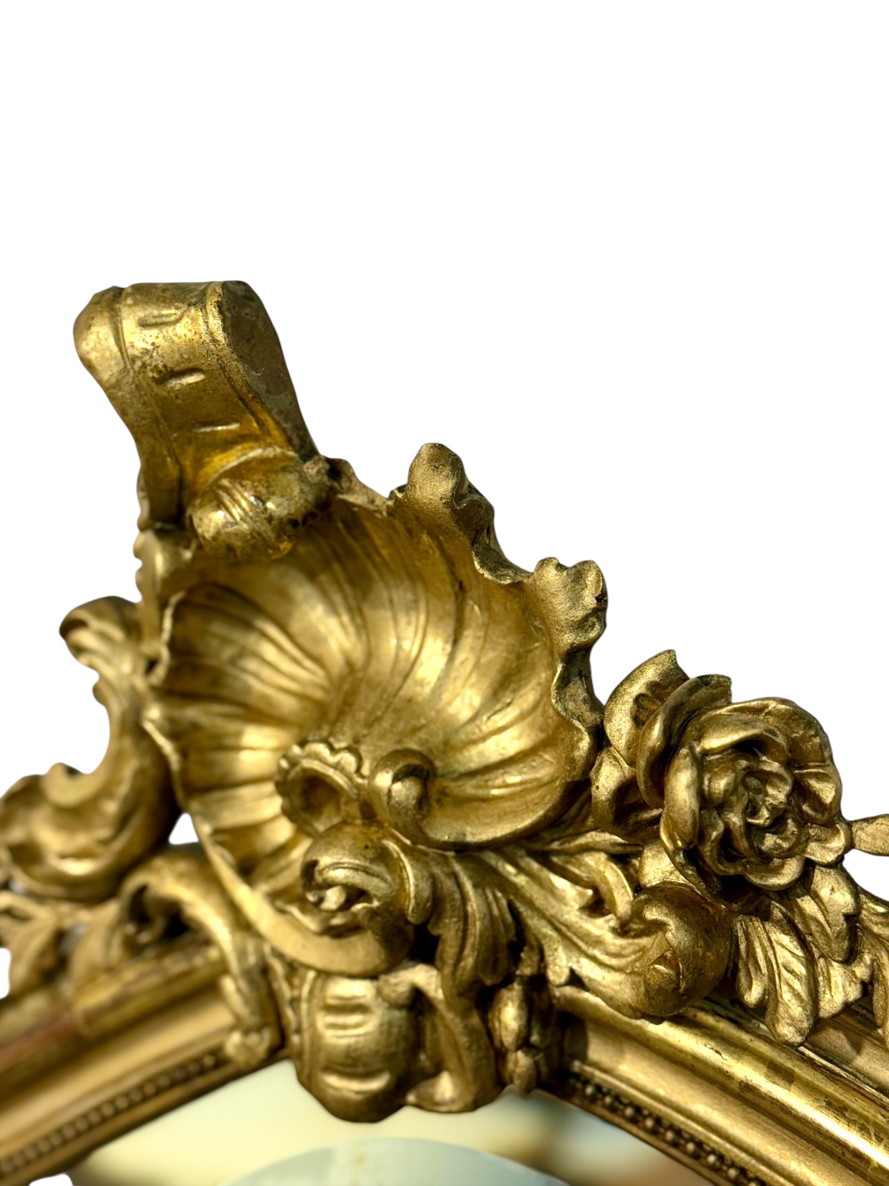The richly carved frame features the hallmark Rococo motifs of the Louis XV period: sinuous scrolls, acanthus leaves, and delicate floral accents, all gracefully arranged to highlight the mirror’s elongated form. The original gilding has aged beautifully, revealing a soft, warm patina with subtle wear that only enhances its authenticity and historic character.