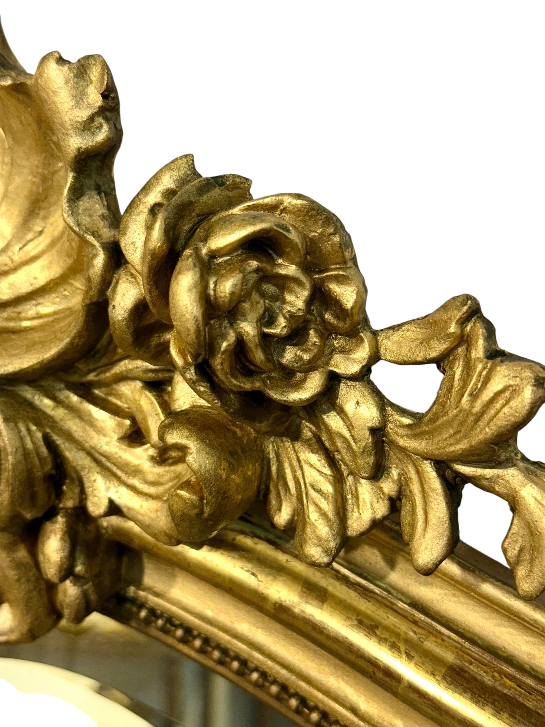This impressive 19th-century French mirror is a stunning example of the Louis XV style, combining elegance, opulence, and timeless charm. Its grand scale allows it to be used as a full-length mirror, either leaned casually against a wall or mounted for a dramatic statement in a living room, bedroom, or entrance hall.